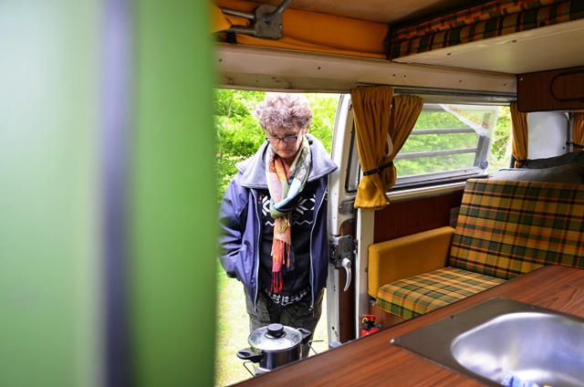 Road Trips bij ons vertrek. Dat laat de wagen ook merken. Je hebt soms het idee dat je aan het roer van een schip zit. Mede door de harde windvlagen zwabbert hij zo nu en dan en moet je alle aandacht er bij hebben. Het voertuig stamt volgens het kenteken uit 1978 en hoewel vrijwel alles gereviseerd is (‘de motor is helemaal vernieuwd’) wordt je als automobilist echt dertig jaar terug in de tijd geworpen. Airco, stuurbekrachtiging, knipperlichten die na de bocht uitgaan, ruitenwissers met interval, het zijn allemaal nog onbekende begrippen in die tijd.Tilstra (29): “Het gaat om het gevoel. Je rijdt in een bijzonder voertuig. Mensen kijken je na als je langskomt”. En daar heeft hij gelijk in. Er is een groep fietsende scholieren die ons al van ver zag aankomen, die speciaal stoppen om bij het passeren met hun mobieltjes een foto te maken van onze gele bus. Ook het vrolijk zwaaien en nakijken door een bromfietser valt ons ten deel.