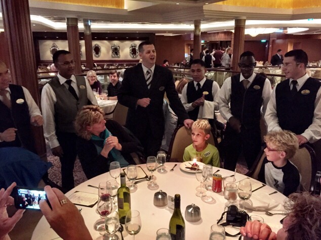 21:00 u. Voortreffelijk gegeten. Heerlijke wijn, zalig dessert (zie foto), goed gezelschap! Veel geleerd over het schip (zeg nooit boot!). Een tafelgenoot die vandaag zijn 8-ste verjaardag vierde werd door de bemanning toegezongen (foto).